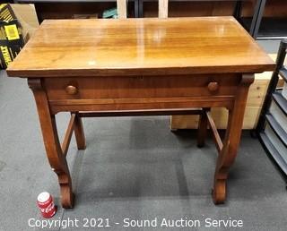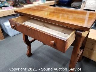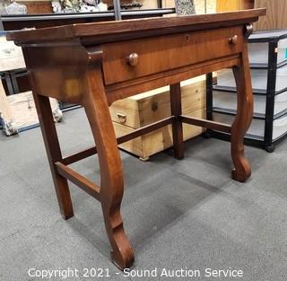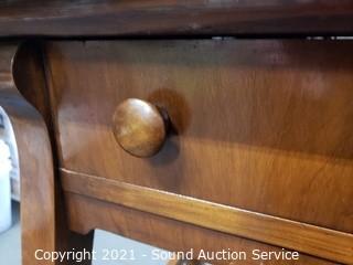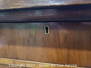 Lot Details: Some of the trim is peeling, some wear along the edge, ink staining the drawer, dovetail joinery. 30.5" H x 33.5" W x 19" D.