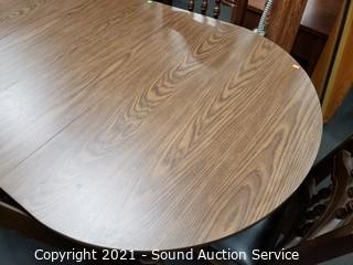 Lot Details: 30" H x 48" x 38" with (2) 11.5" leaves. Some wear to the finish, mainly on the chairs.