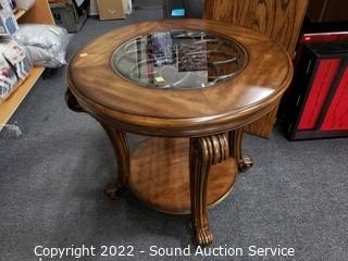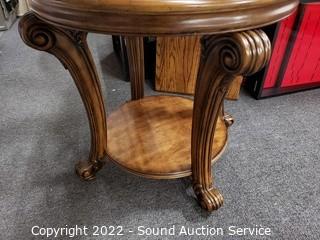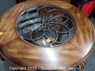 Lot #0213: Ornate Filigree Wood & Glass Top Round Table
