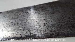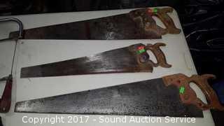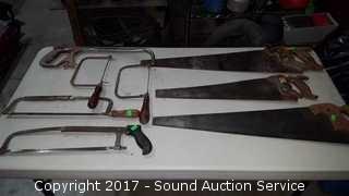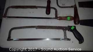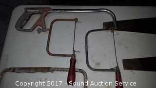 Lot #0087: 3 Vtg. Wood Saws, Hacksaw & Coping Saws