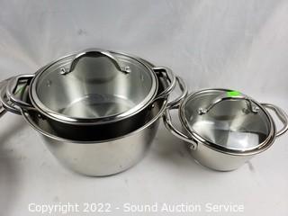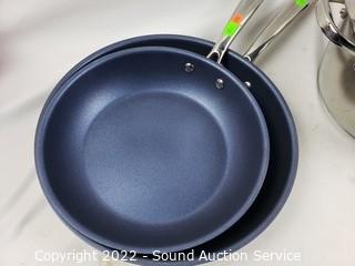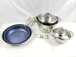 Lot Details: Tramontina Stainless pots 6qt, 3qt & 1.5qt. Large boiling pot does not come with lid. Granitestone Diamond Pro 10" & 12" non-stick skillets. 12" pan has a small scrape.