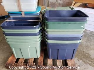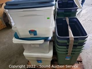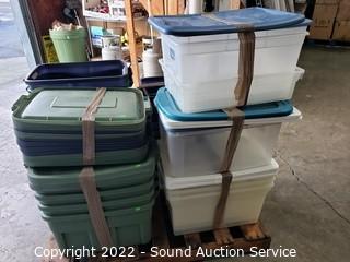 Lot #0002d: Pallet of Storage Totes 12 rubbermaid w/lids and more