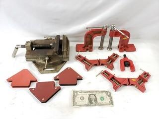 Lot #0298: Assorted Clamps, Welding Magnets & Machinist Vise