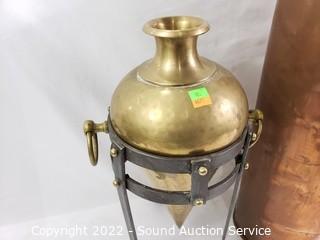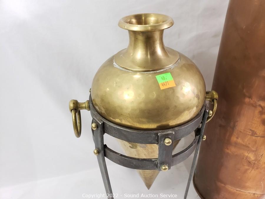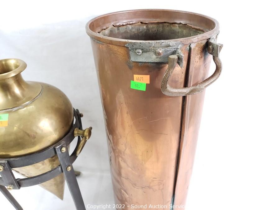 Lot Details: Wrought iron stand with hammered brass vessel 17" H x 7" Dia. Handcrafted solid copper umbrella stand, vessel 19.5" x 7.5".