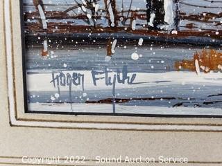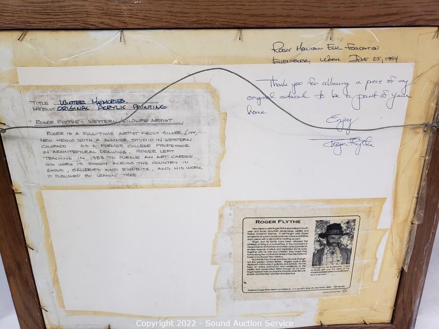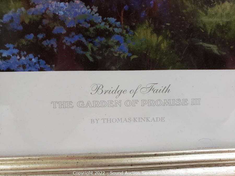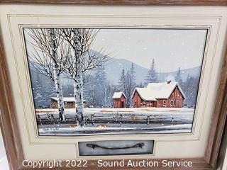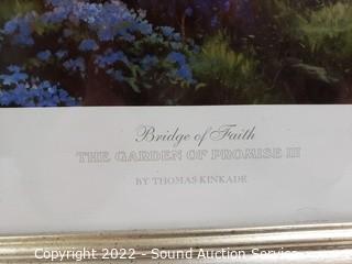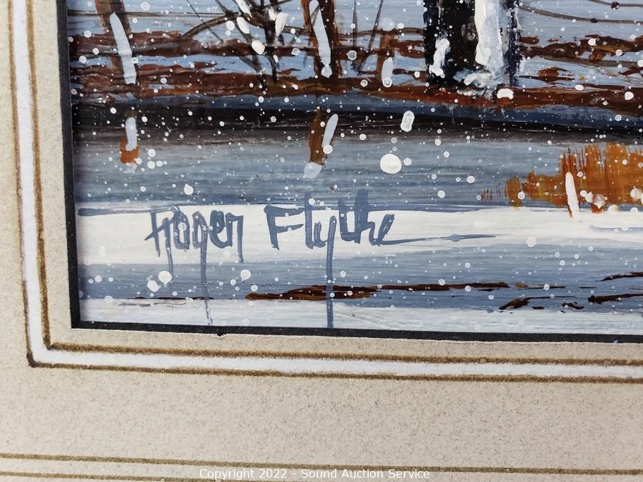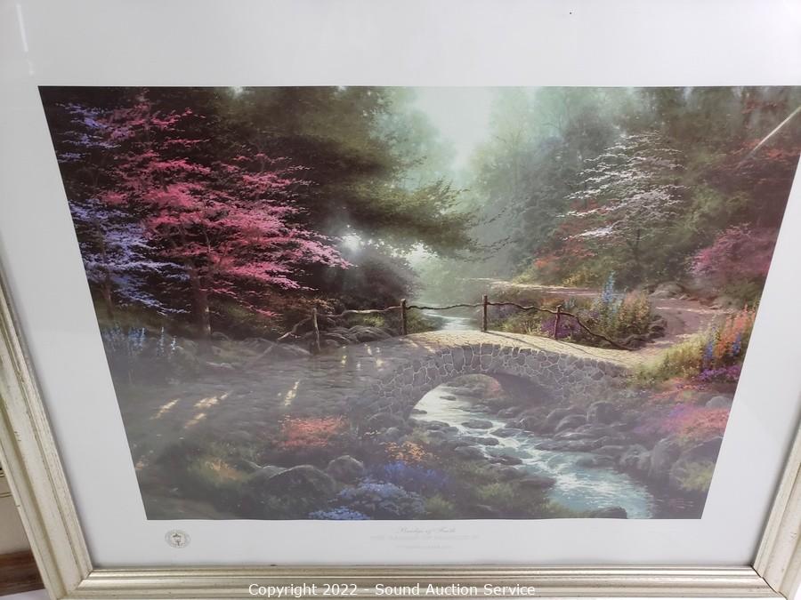Lot Details: The Roger Flythe is original acrylic oil painting, signed, with artist information on the back, titled "Winter Memories" 18.5" x 22.5". And Thomas Kinkade Bridge of Faith print. 29" x 23".