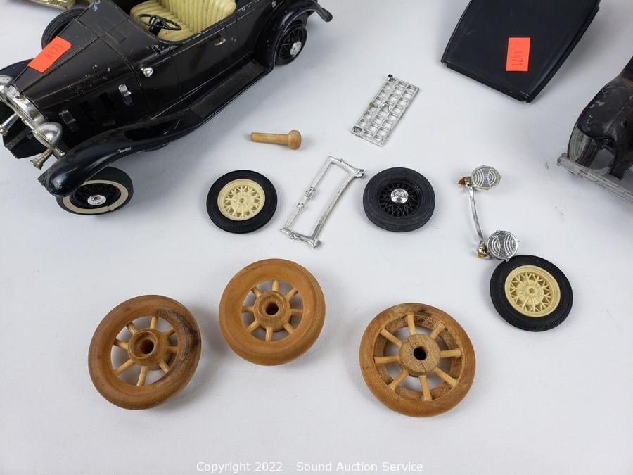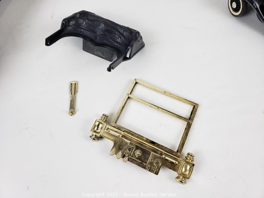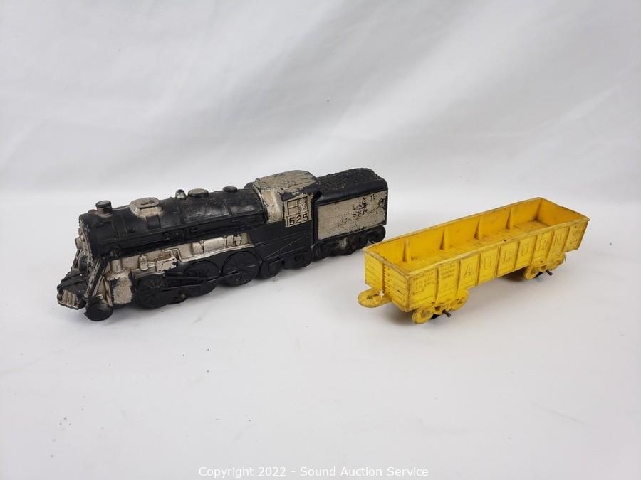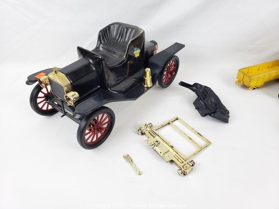 Lot Details: 2 are Hubley Toys, 1 is a Jim Beam bottle, sealed, 2 vinyl train cars. Some broken pieces.