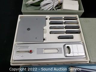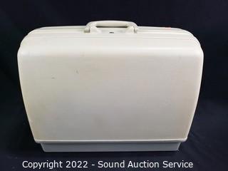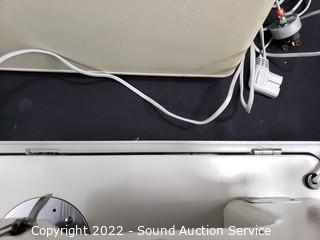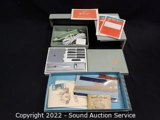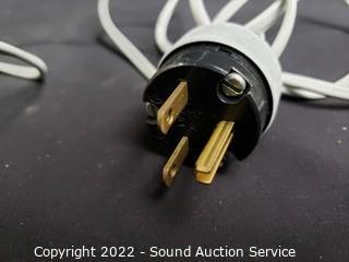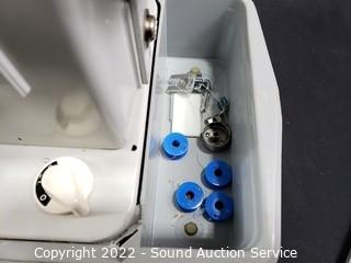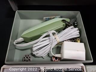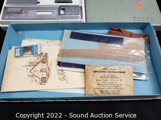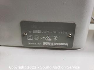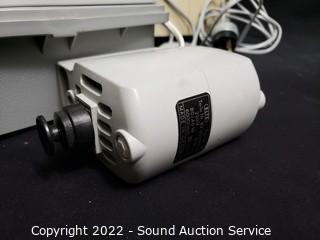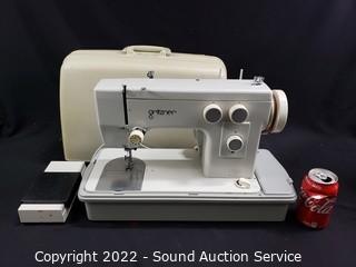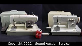 Lot Details: Vtg. Sears Kenmore Sewing Machine; Has power, belt is old, doesn't grab, comes with foot pedal. Gritzner German Sewing Machine; Comes with foot pedal, electric shears & accessories. European plug, unable to test. Motor not mounted to case, missing a hinge.