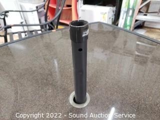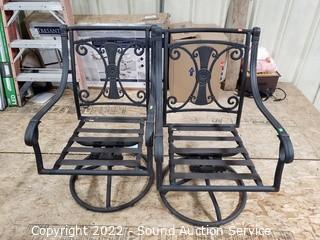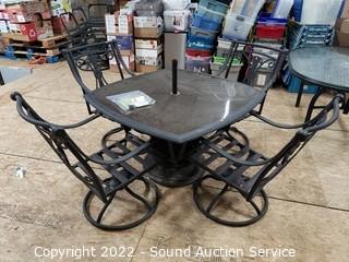 Lot Details: Composite base, built in umbrella pole with hardware, 26.5" x 44" x 44". Chairs are rocking.