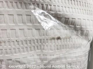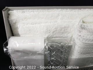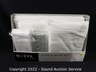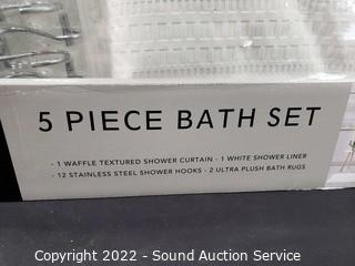 Lot Details: Bridgeport white color. 1 waffle textured shower curtain 70" x 72", shower liner, 12 stainless hooks, 2 plush bath rugs, 17" x 24" & 21" x 34". Shower curtain has a dirty spot, no other issues.
