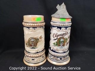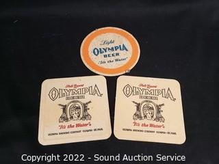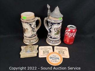 Lot #0365: Vtg. Olympia Beer Steins, Pin Patch & Coasters