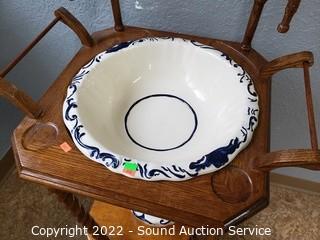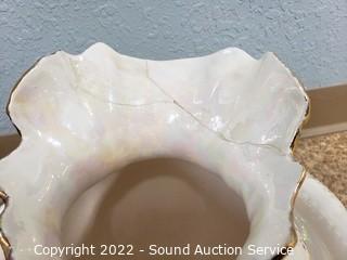 Lot Details: Iridescent yellow rose print, initialed DY, 11" H x 15" Dia, pitcher has been repaired. Delft blue hand painted, 12" H x 15" Dia. Overall 54" H x 22" W x 18" D.