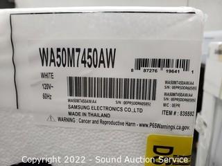 Lot Details: Model WA50M7450AW/A4, Serial OEPR5DDR605892. High-efficiency, VRT plus, Self Clean. Was factory sealed, noticed front side panel a little bowed at the top, so opened and ran it through a cycle, works great, very quiet. Believe drum hit the panel in transport and broke the plastic clip that holds top to side panel, otherwise no issues. AS IS. Approx. $850 retail value. 45" H x 27" W x 29.3" D.