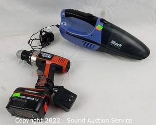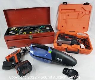 Lot #0122: Skil Jigsaw, B&D 12v Drill, 19" Toolbox & Hand Vac
