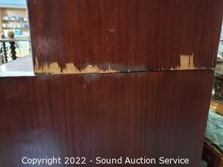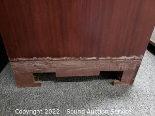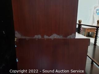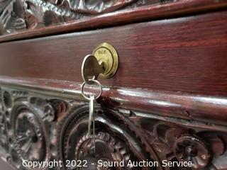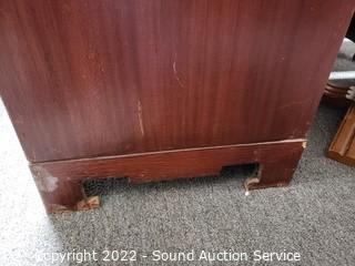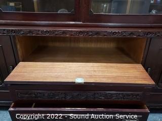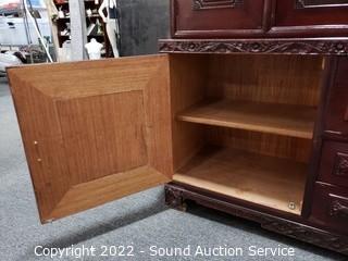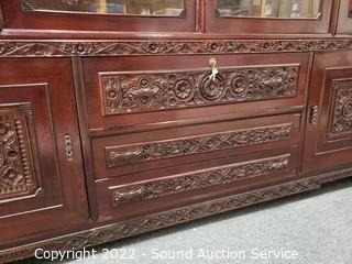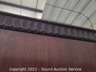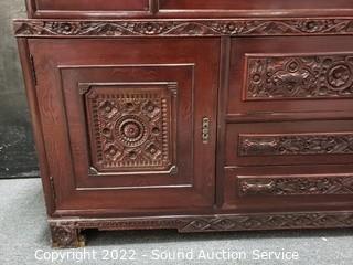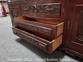 Lot Details: Ornately carved. Appears to be genuine wood veneer construction, hollow to make it lighter. Unsure what kind of wood. Top drawer is locking with key. Some damage to veneer on the bottom of top piece and top of bottom piece. Various knicks dings and other wear. 78" H x 84" W x 14.5" & 18" D.