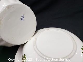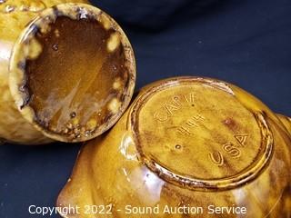 Lot Details: VB Athena White Floral & Calif. Pottery, 8" to 9.5" tall, 10" to 11.5" wide. Yellow basin has a small chip on the rim.