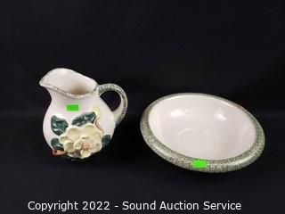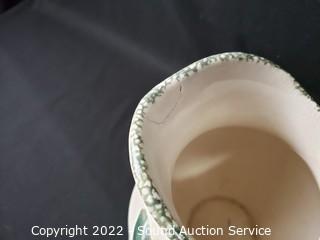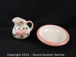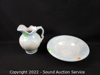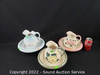 Lot Details: Arnel's and 2 high relief floral. 6.5" to 7" tall, 5" diameter pitchers, 9" to 10" diameter basins. Green pitchers spout has been repaired.