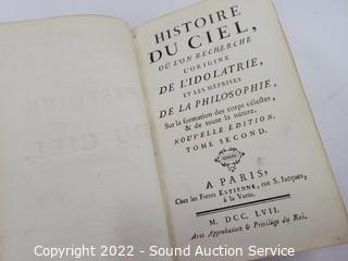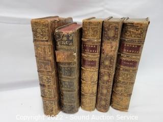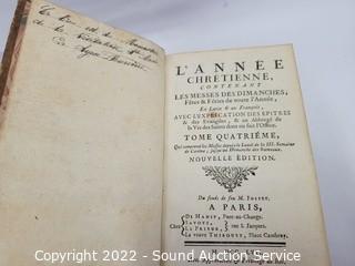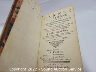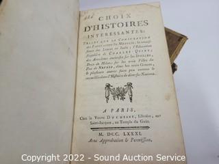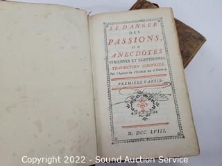 Lot Details: 1781 & 1782 Vol. 1 & 2, "Choix D'Histoires". 1758 Le "Danger Des Passiions ou Anecdotes". (2) 1757 "L'Annee Chretienne" Tomes. Various wear, but intact which is impressive given their age. Refer to photos for condition & title pages.