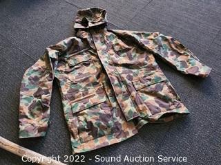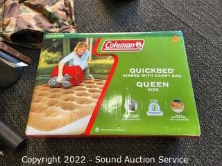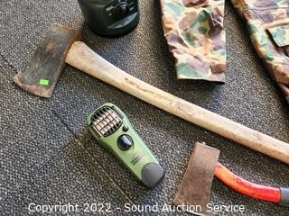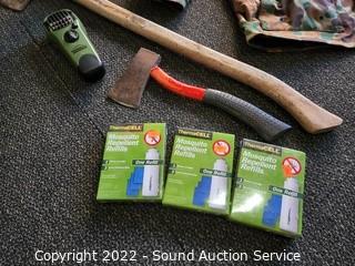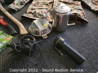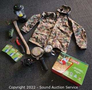 Lot Details: Splitting axe, hatchet, lantern, coffee percolator, camo rain jacket S: L, Coleman queen air mattress w/pump, Thermocell mosquito repellent.
