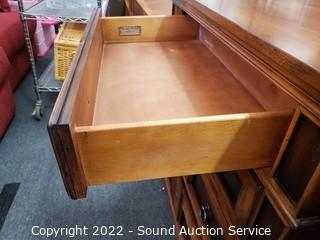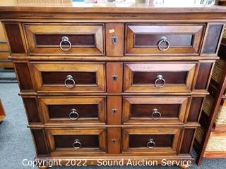 Lot Details: Medium & contrasting dark finish. Appears to be solid wood construction. Well made, a few minor scuffs, overall great condition. 36" H x 37.5" W x 19" D.