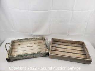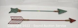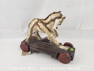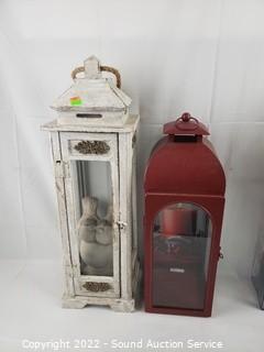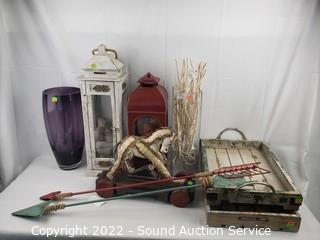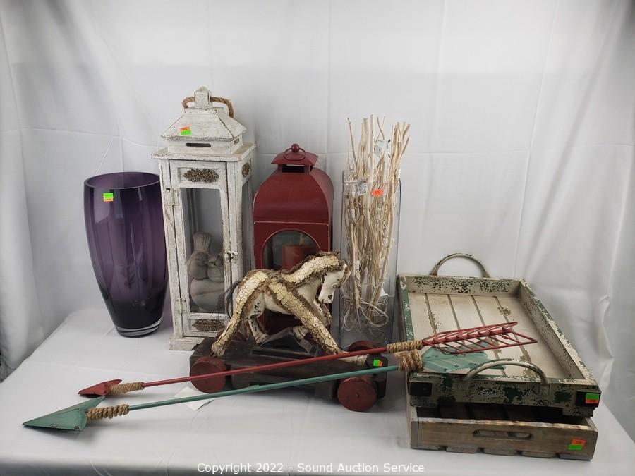 Lot Details: Hanging Candle Lantern boxes (1 with bird statuary), lighted branch decor, rocking horse, wood trays, metal art arrows. Vase is 15" H x 7" Dia.
