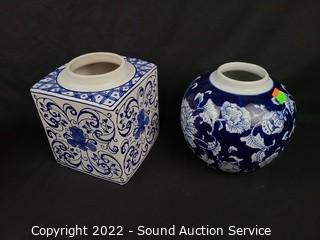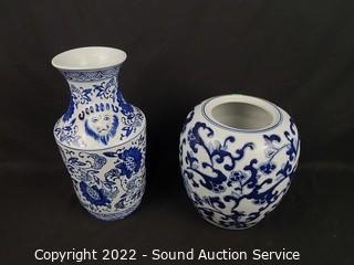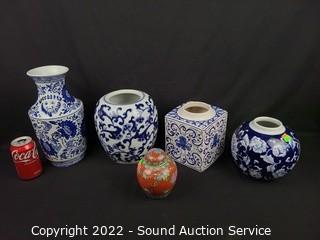 Lot #0143: 4 Blue & White Pottery Vases & Hand Painted Urn