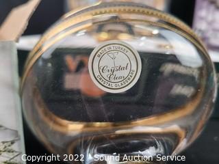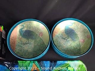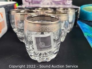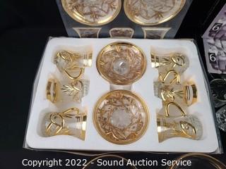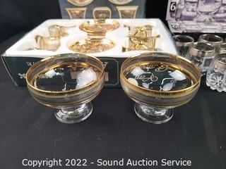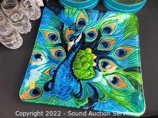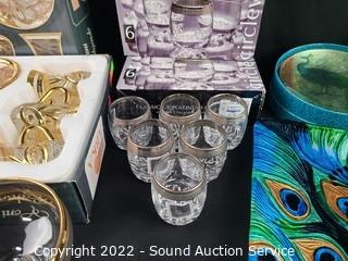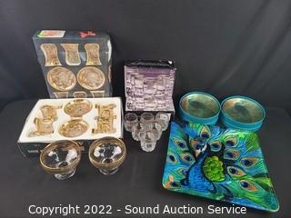 Lot Details: 8 Pier-1 Peacock snack plates, 12" peacock plate, 2 Crystal Clear Legacy 12k Gold & Platinum Dessert Dishes, 12 Circleware 2.5oz Platinum Rim Shot Glasses, (2) 6pc Gold Painted Tea sets. Most in original packaging.