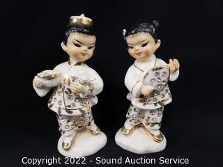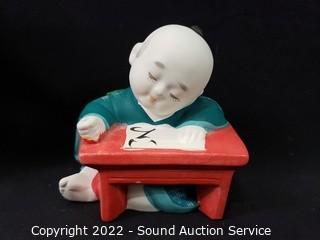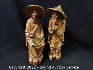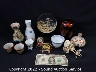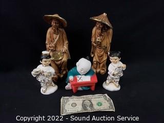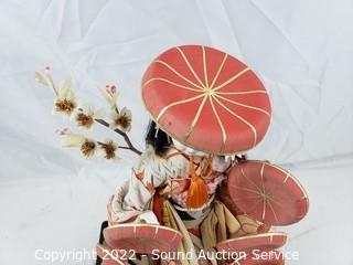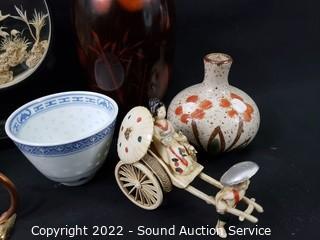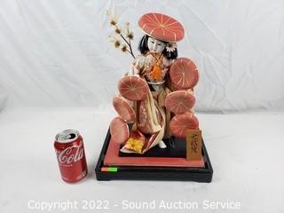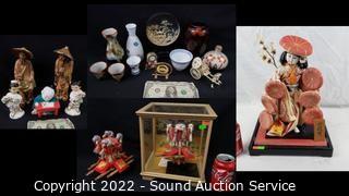 Lot Details: Handcrafted Silk Geisha Doll w/Stand, 13" tall, 11" x 9" stand. 2 Handcrafted Silk "Portable Throne" Decor. Assorted Asian Decor. 5pc Ceramic Asian Figure Decor.
