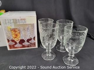 Lot Details: Shannon Crystal Sweet n' Low holder, & gravy Boat, (4) Fifth Avenue 16oz Beverage glasses.