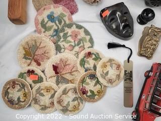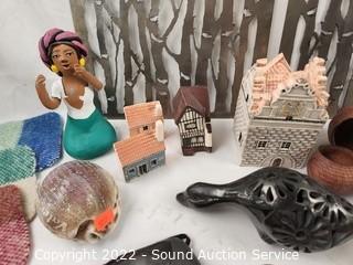 Lot Details: House figures, Carved wood Don Quixote (missing spear made in Spain), trivets, bobble head & more. Refer to photos for lot contents.