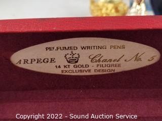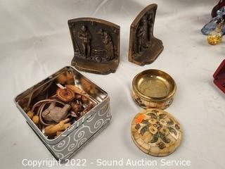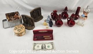 Lot Details: Perfume bottles, cruets, bone trinket box, pen set, bookends & more.