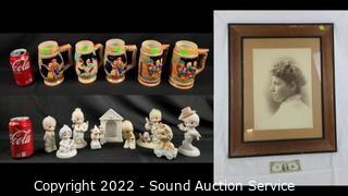 Lot Details: The Patrician Lady Vintage Framed Portrait Photo, 27" x 22.5". 5 Japanese Stoneware Steins. 9 Precious Moments Fine Porcelain Figures.