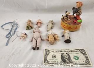 Lot Details:  5" H x 4" dia music box, 2" to 3" dolls.