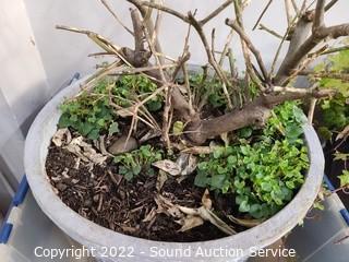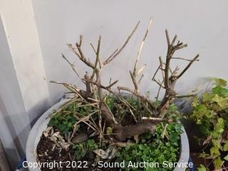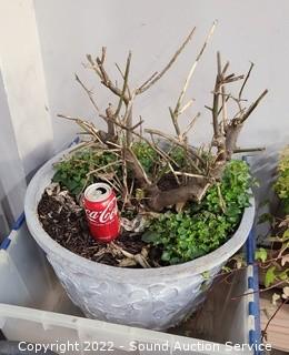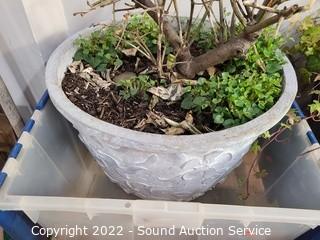 Lot Details: 14" x 19" diameter planter pot, 20" T x 18" spread. Has some flowers growing in the pot.