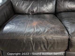 Lot Details: Each end reclines. Unsure if genuine leather or not, appears to be, possibly blended leather. Some wear to the finish on the seats. mainly left side. 34" H x 89" L x 37" D x 18" to seat.