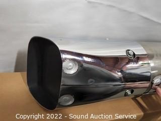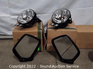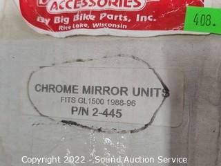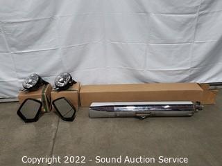 Lot Details: Honda Goldwing Exhaust pipes, Left & Right Front Light Assemblies, #334-2009R&L-AS. 2 Black finish Chrome Mirror Units.