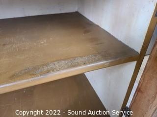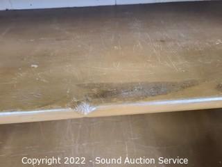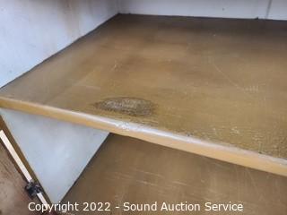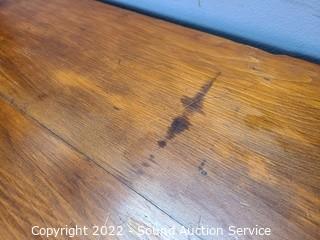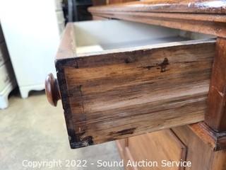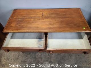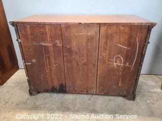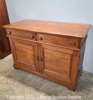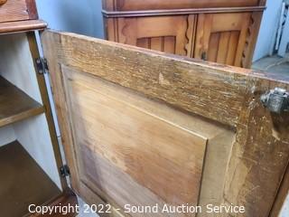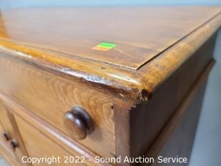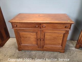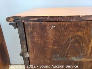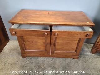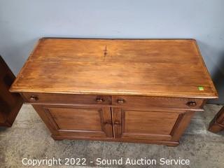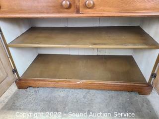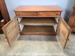 Lot Details: Resembles a wash station or bathroom cabinet. Has some age to it. 32" H x 46.2" x 20.5" Solid wood construction, in good condition.