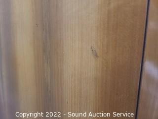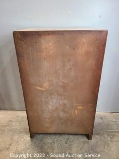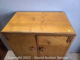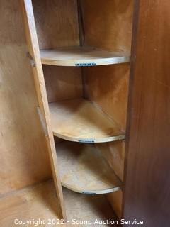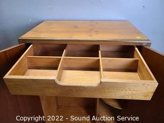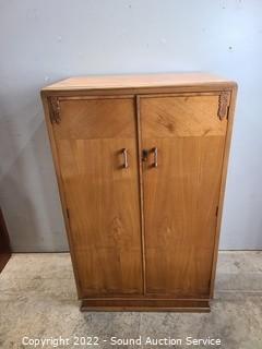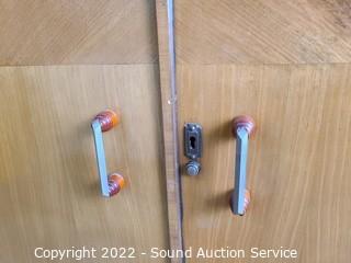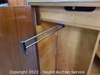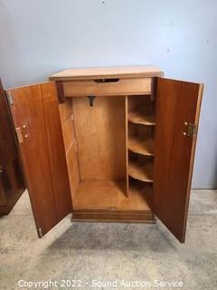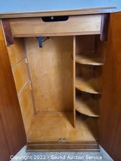 Lot Details: Locking, no key. Single divided drawer, hanging rod & shelves. 49.5" H x 30" W x 18" D. Some minor wear, overall great condition.