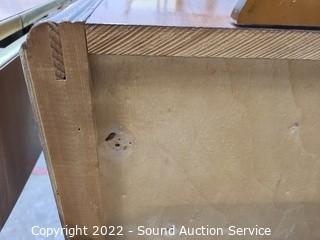 Lot Details: Some wear to the finish, mostly around the edges of the mirror. 32" x 47" x 18" with 39" x 37" mirror topper. Appears to be solid wood construction, dovetail joinery.