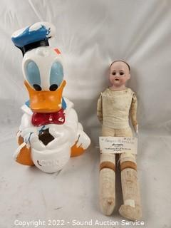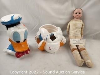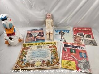 Lot Details: Donald Duck cookie jar, Golden Dragon certificates, vintage magazines, vintage Armond Marcelle doll.