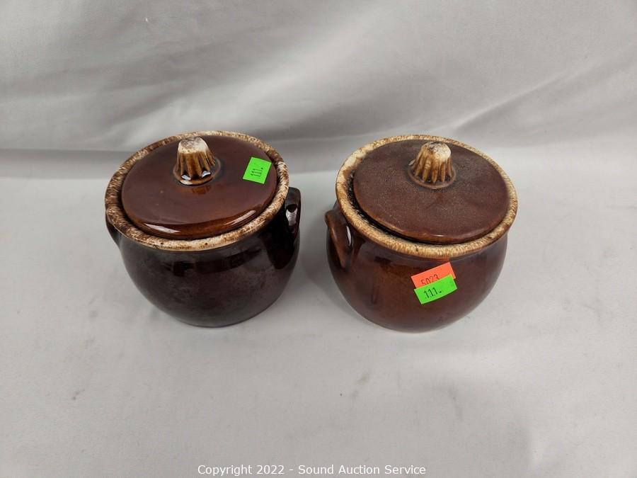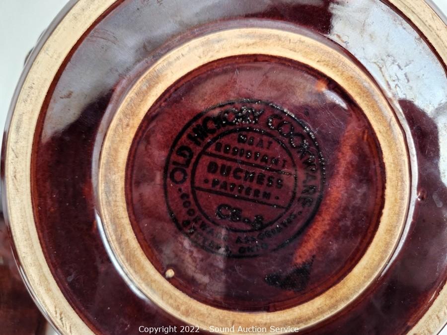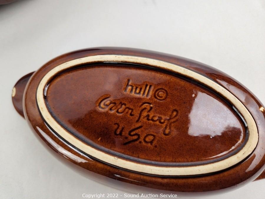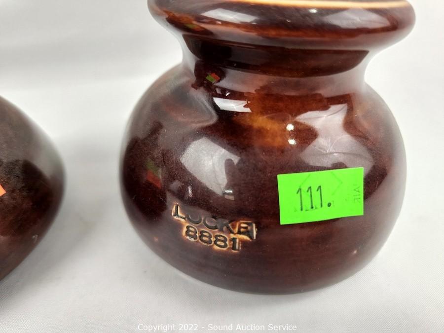 Lot #0111: 6pc Hull Oven Proof Stoneware & 2 Locke Insulators