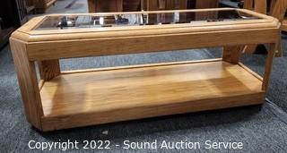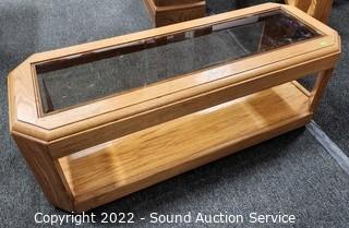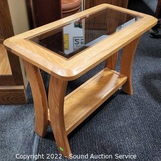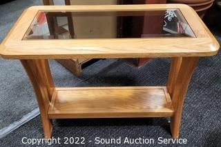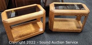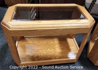 Lot #0004: 4 Solid Oak 2-Tier Glass Top Tables
