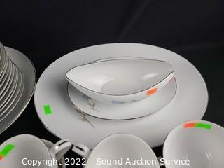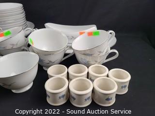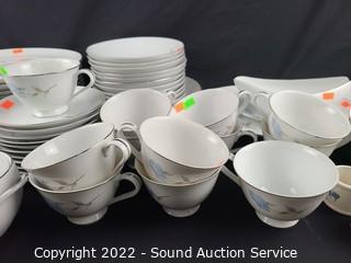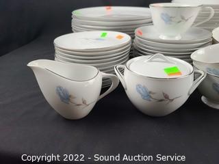 Lot Details: 14 teacups, 12 saucers, 6 napkin rings, 12 bowls (2 are chipped), 12 dinner plates, 12 snack plates, cream, sugar, gravy boat, 14" platter, 9" bowl.