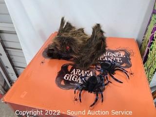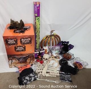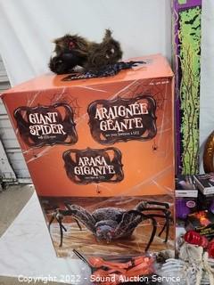 Lot Details: Giant 4.5ft spider, lighted branch stakes, metal art pumpkin, projectors, skeleton & more.