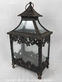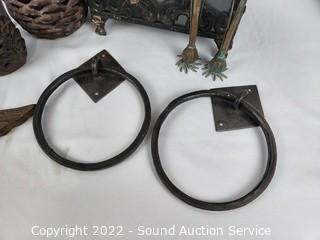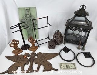 Lot Details: Bath hand towel rack, cast iron wall decor, glass and cast metal candle lantern, Cast Iron lanterns, Cast Iron finials, Cast iron towel rings, ceramic wall decor.