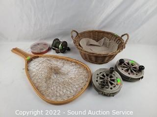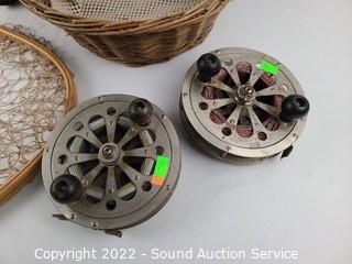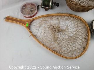 Lot Details: 2 Pflueger Sal-Trout, Pacific Free-Spool, 21" x 11" landing net, organizer, 4" x 11" basket.