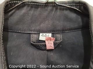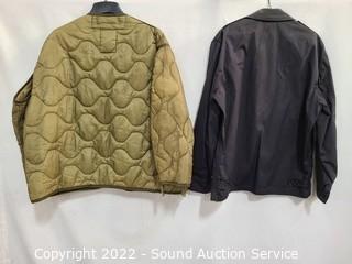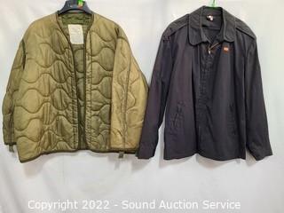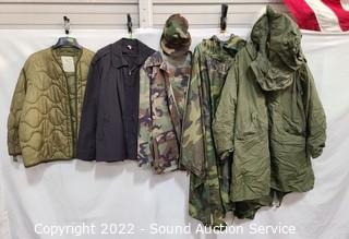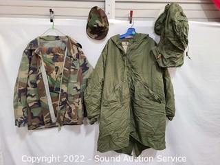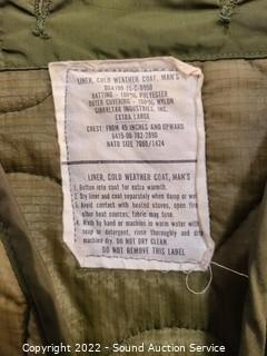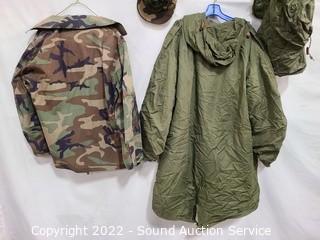 Lot Details: Cold weather liner XL, 44L black Jacket, Military Fatigues (shirt, hat, slacks) don't see a size, parka & cold weather long jacket w/hood approx. S:XL.