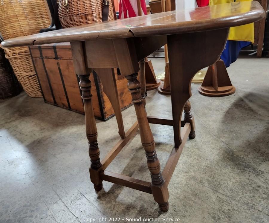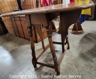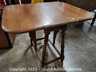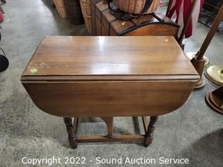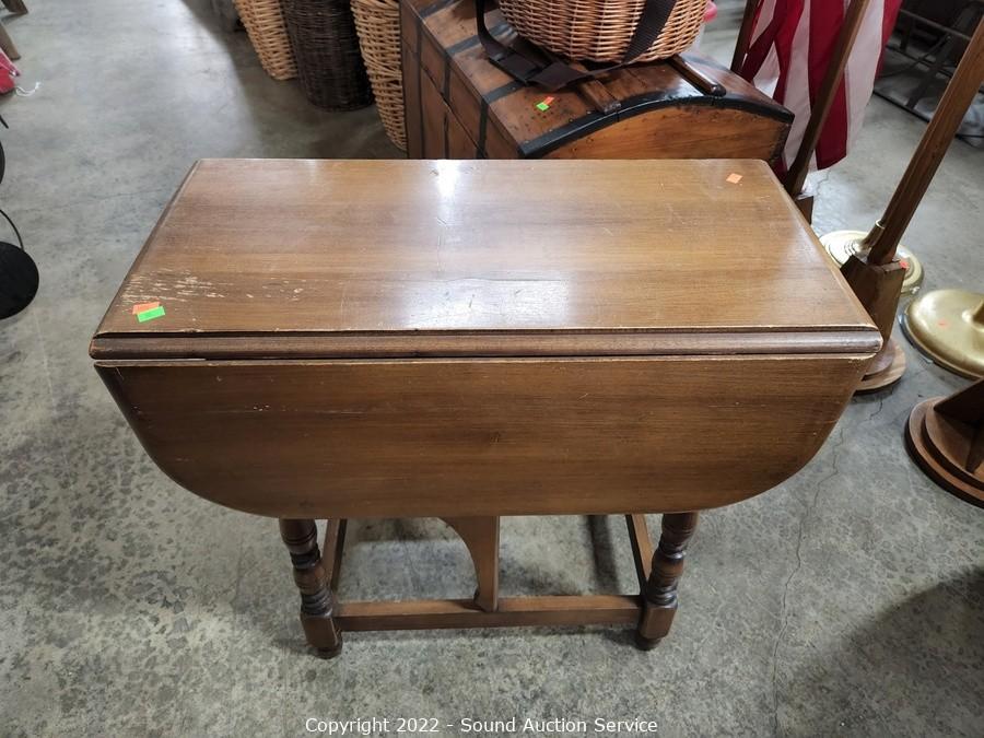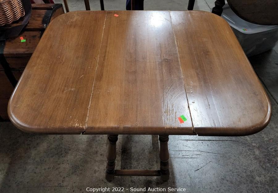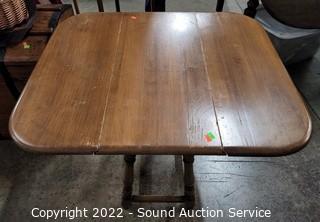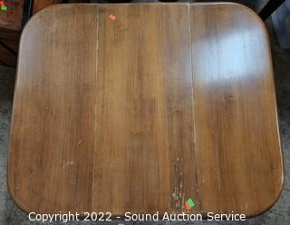 Lot Details: 24.5" x 26" x 12" with (2) 10" drop leaves. Some wear to the finish. Appears to be solid wood.