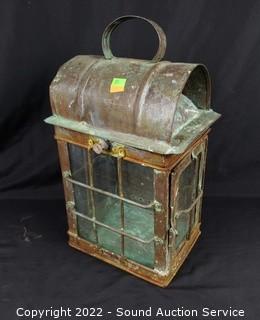Lot Details: Oil lamp believe is marked Thompson, no chimney. 13" H x 8" x 6" Lantern.