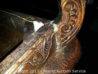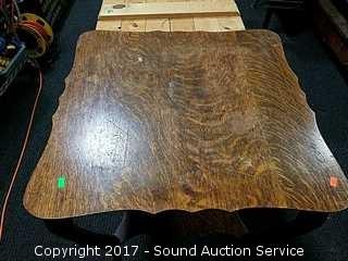 Ornately carved. Approx. 29" tall, 23.5" square. One of the legs is broken where it attaches to the top. Please refer to photo's.