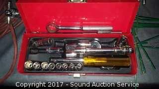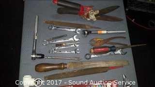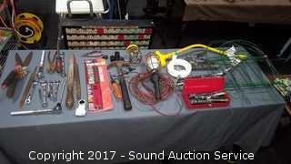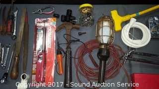 Includes: socket wrenches, 3 way plug, droplight, hammers, wrenches, sink faucet shower attachments, bits and more.